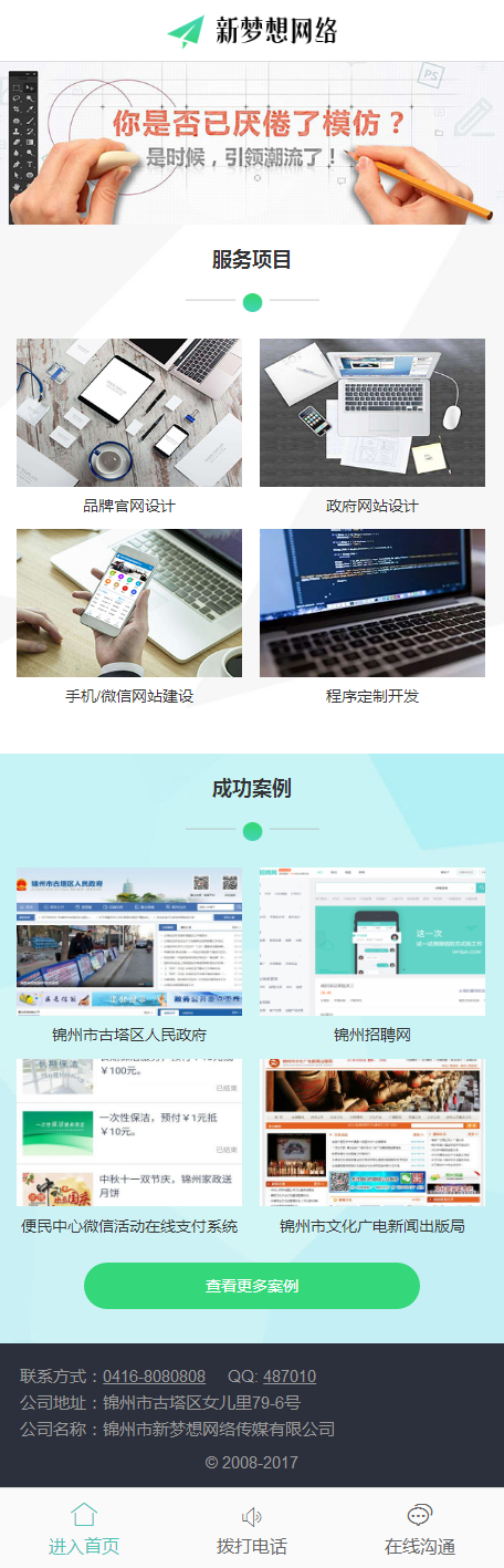 錦州市新夢想網(wǎng)絡(luò)傳媒有限公司成立于2008年,是立足于錦州的專業(yè)互聯(lián)網(wǎng)服務(wù)提供商,也是覆蓋遼西五市的互聯(lián)網(wǎng)企業(yè)。致力于為事業(yè)單位、政府機(jī)關(guān)、企業(yè)提供網(wǎng)站建設(shè)、微信平臺搭建、軟件開發(fā)和企業(yè)大型商務(wù)活動(dòng)的策劃等服務(wù)。